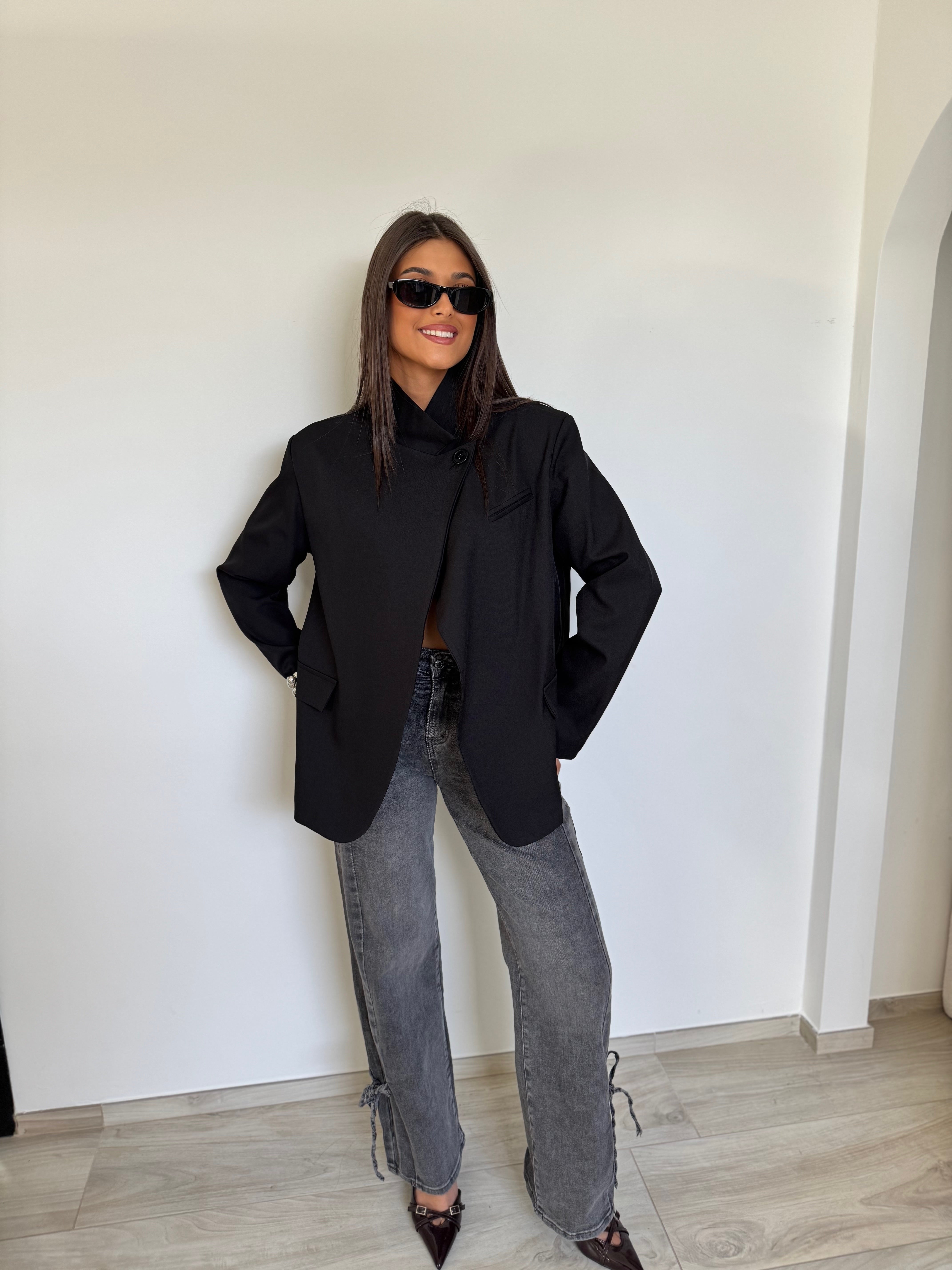 Blazer structuré avec col montant et fermeture asymétrique par bouton. Coupe élégante et moderne avec épaules légèrement marquées. Une pièce forte qui apporte une touche sophistiquée à n’importe quelle tenue.