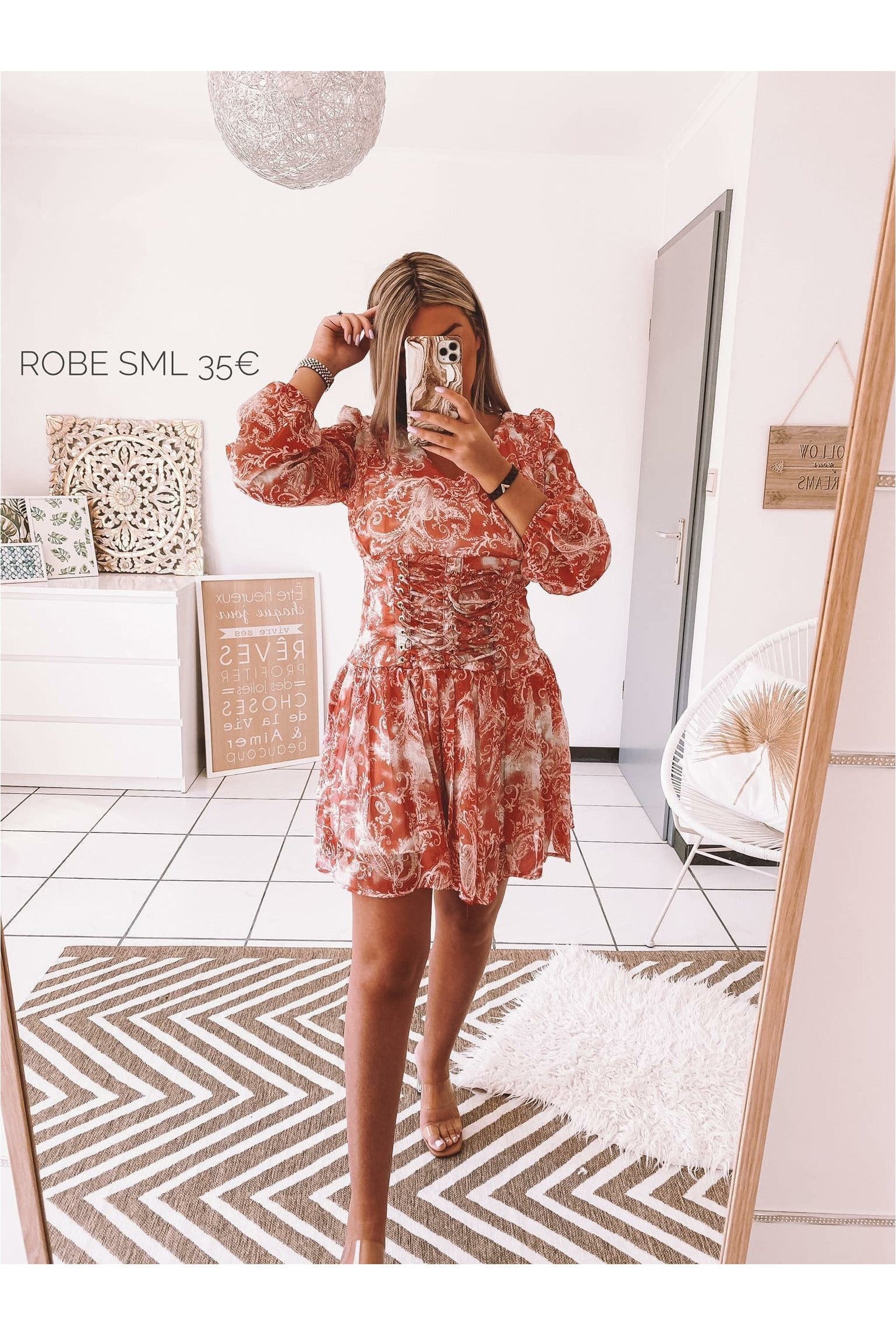 Wir fallen auf dieses großartige romantische Kleid. Motive und eine Farbe sind gefallen, von der Taille umgeben und unten breit. Sie wird perfekt zu Absätzen und einer Tasche gehen, um Ihr Outfit zu verfeinern.