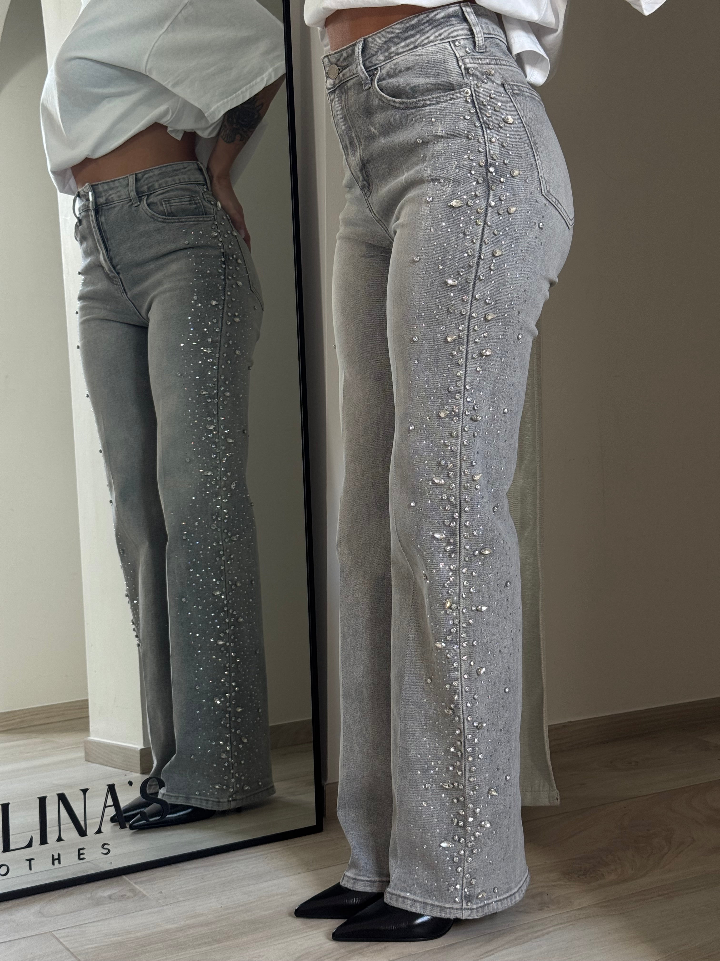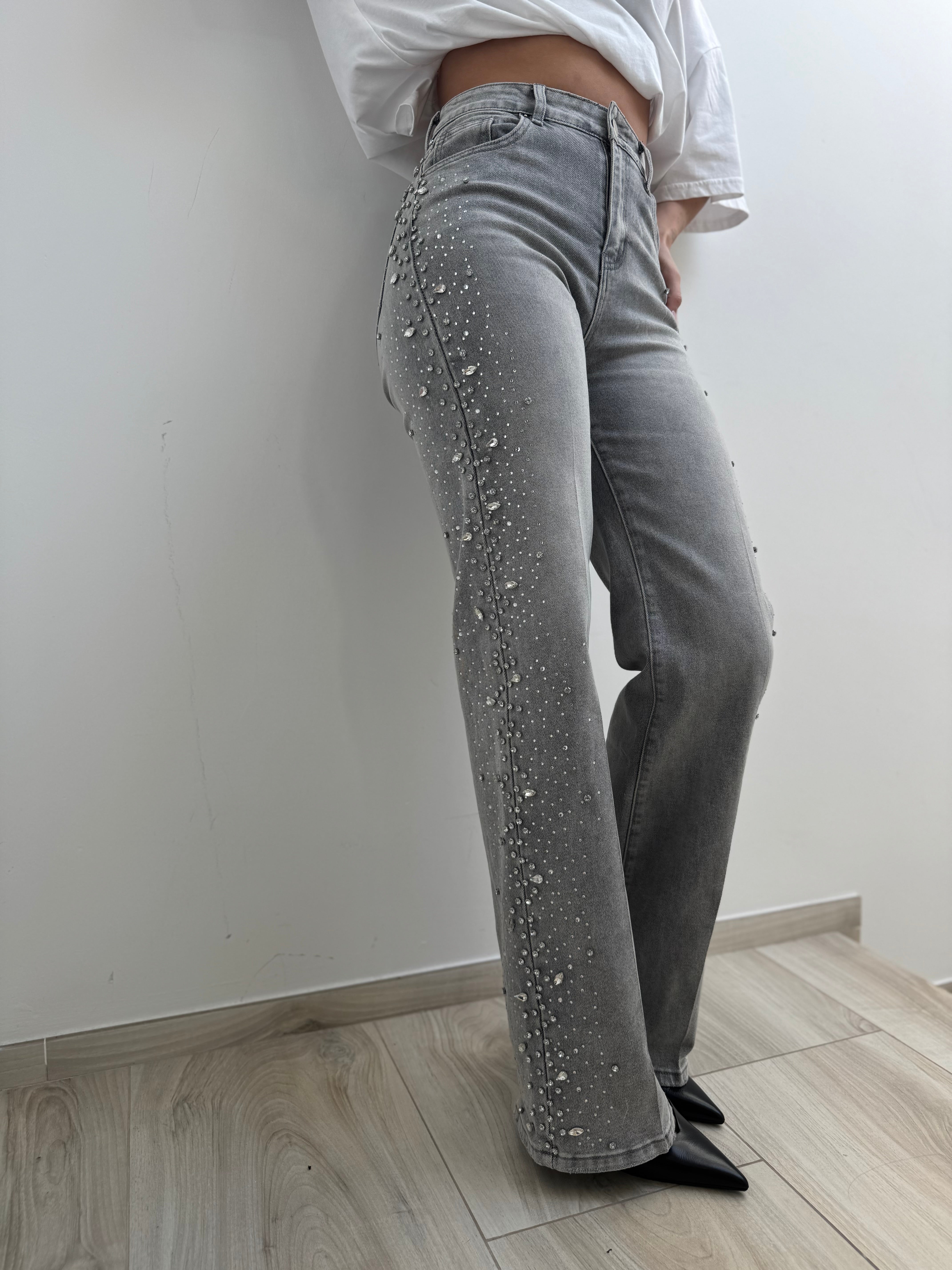 Apporte une touche de glamour à ton look denim avec ce jean gris clair orné de strass. Sa coupe droite flatte la silhouette tandis que les détails scintillants placés le long de la jambe apportent une allure tendance et ultra féminine. Parfait pour upgrader une tenue casual avec une touche brillante, on l’adore porté avec un crop top et des talons ou des baskets pour un look plus décontracté.