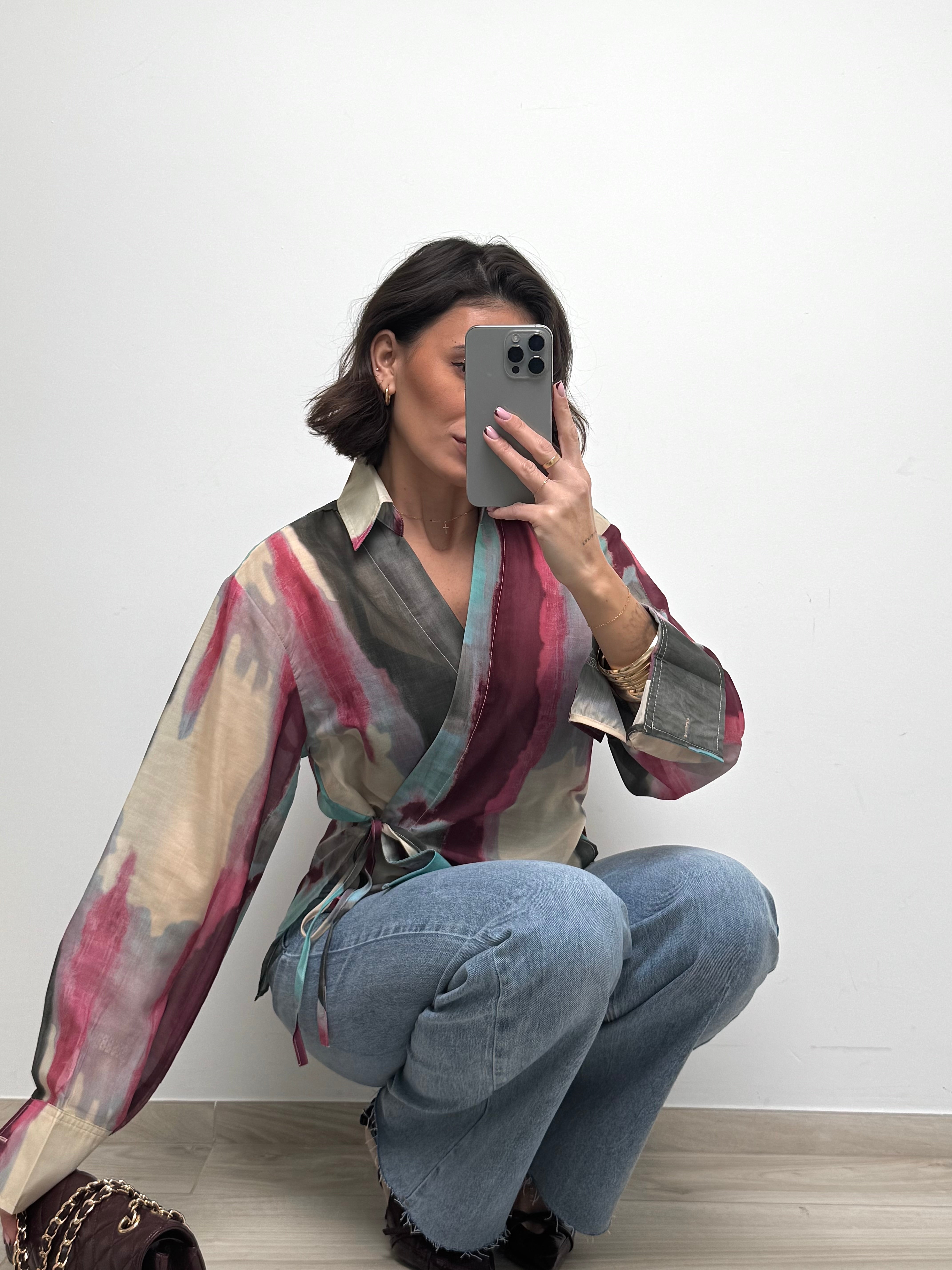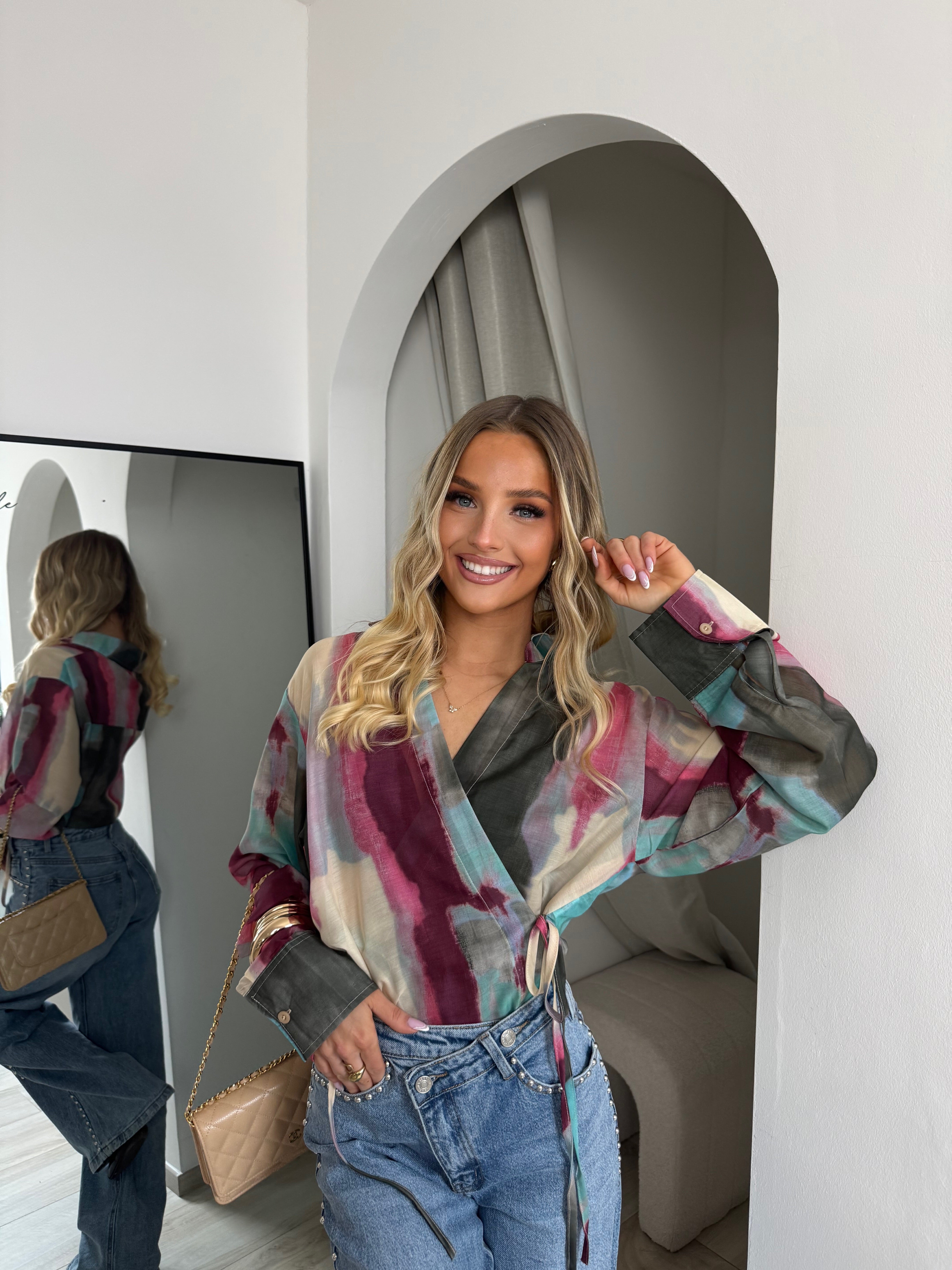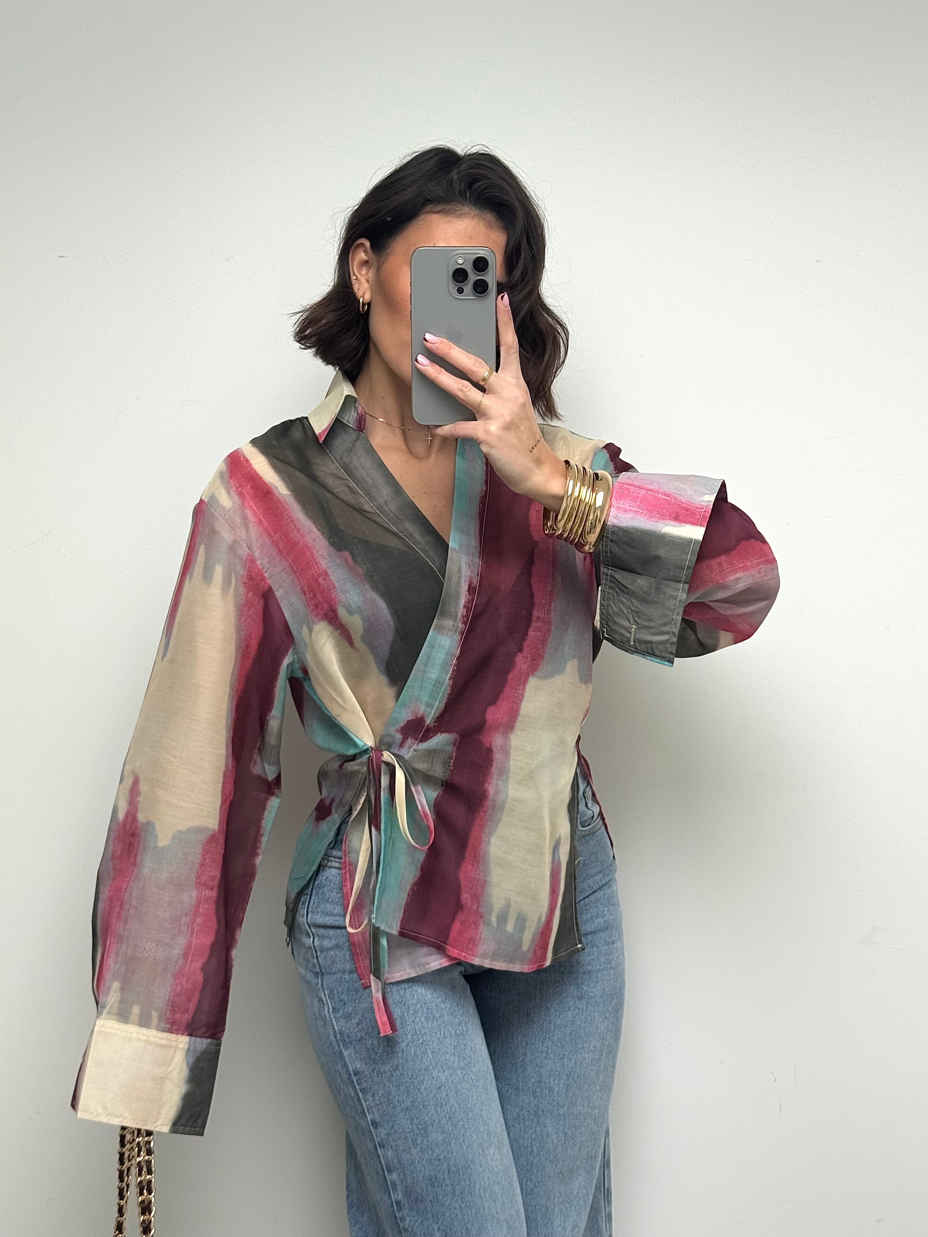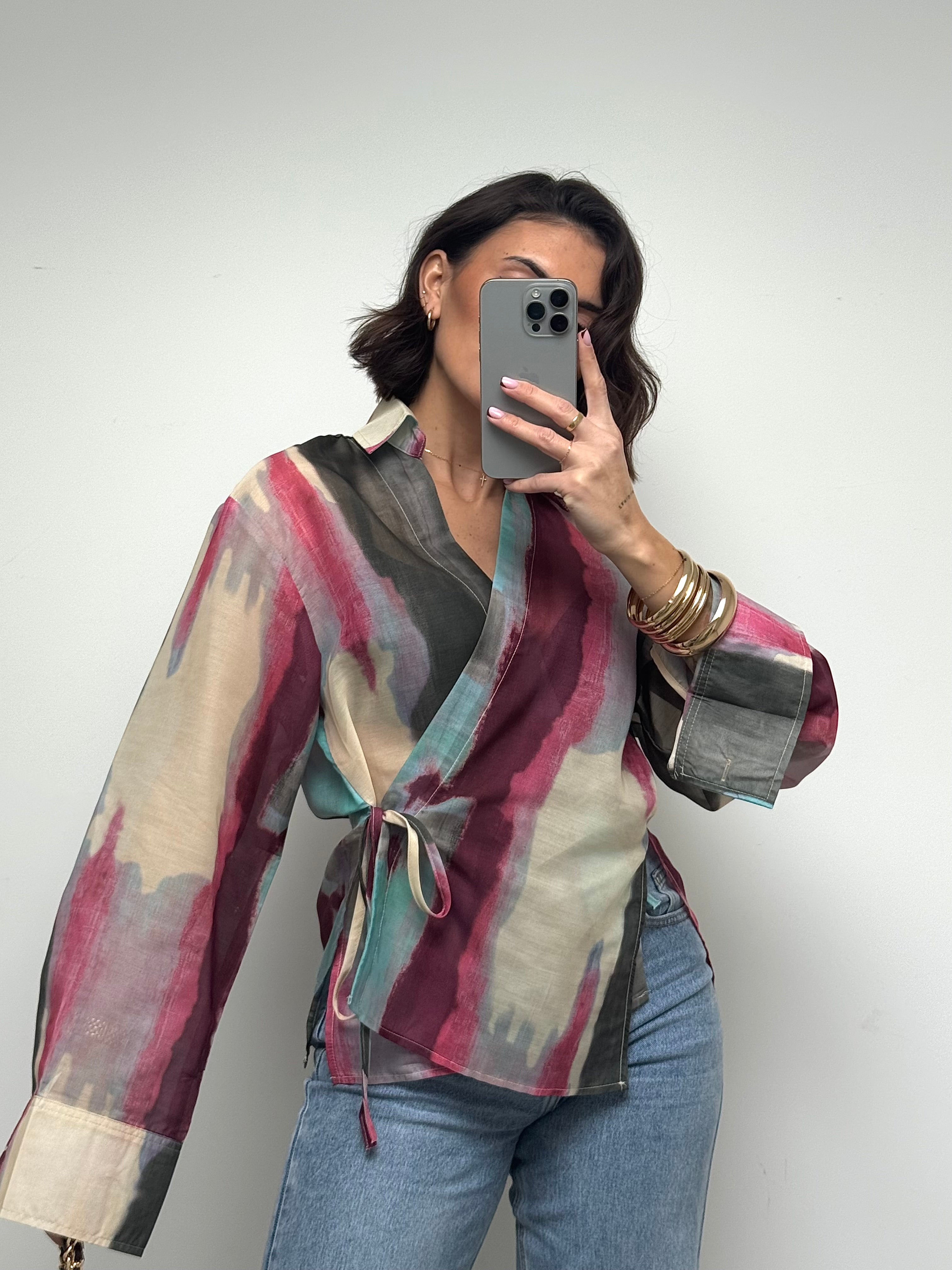 Délicat et résolument moderne, ce chemisier cache-cœur multicolore séduit par son jeu de transparence et son imprimé artistique aux nuances douces et lumineuses. Sa matière légère apporte une sensation de fluidité et de mouvement, tandis que sa coupe féminine met naturellement la silhouette en valeur. Les liens à nouer ajoutent une touche élégante et permettent un ajustement parfait. Une pièce pleine de caractère, idéale pour sublimer un look du quotidien ou apporter une note sophistiquée à une tenue plus habillée.