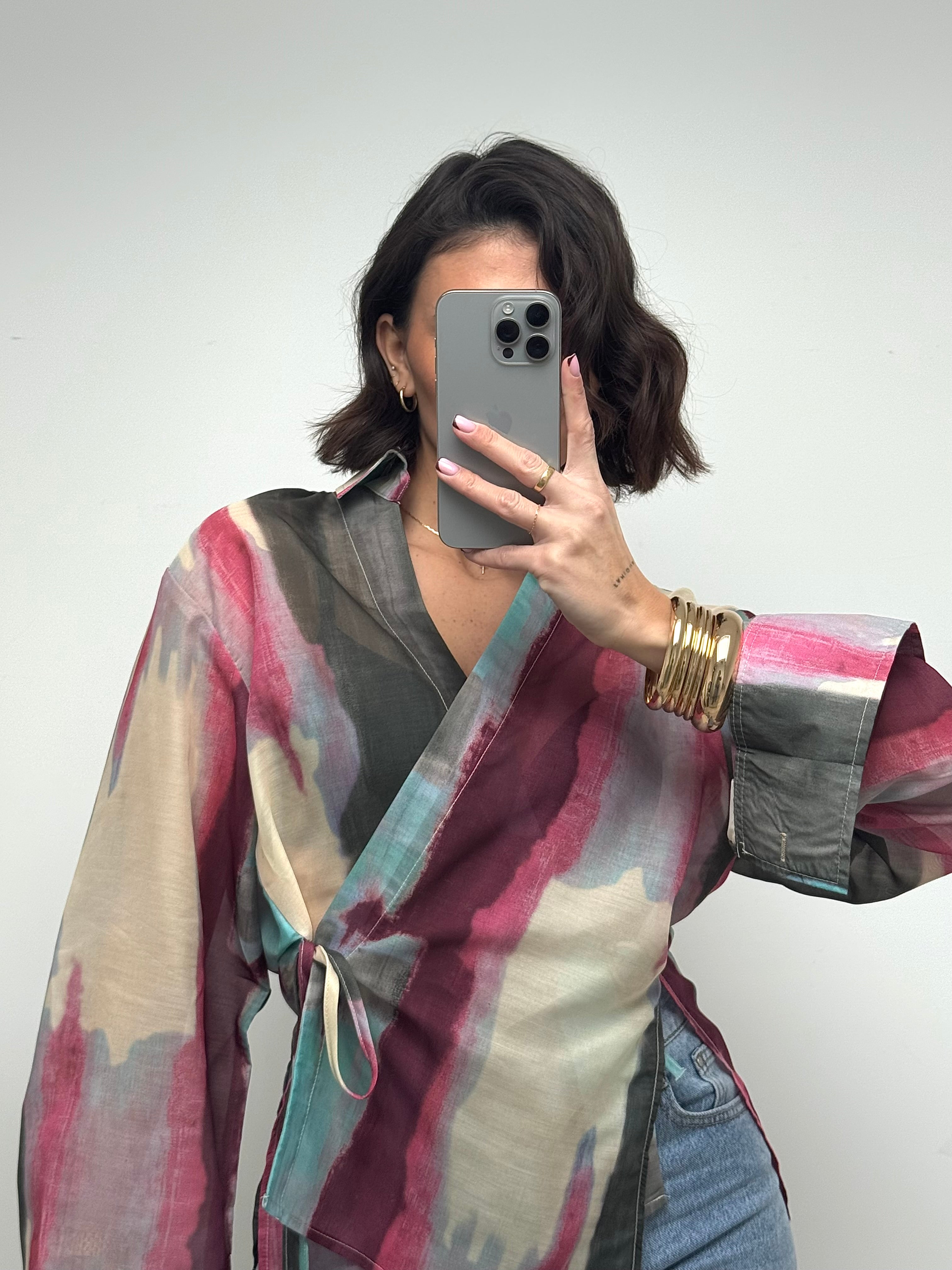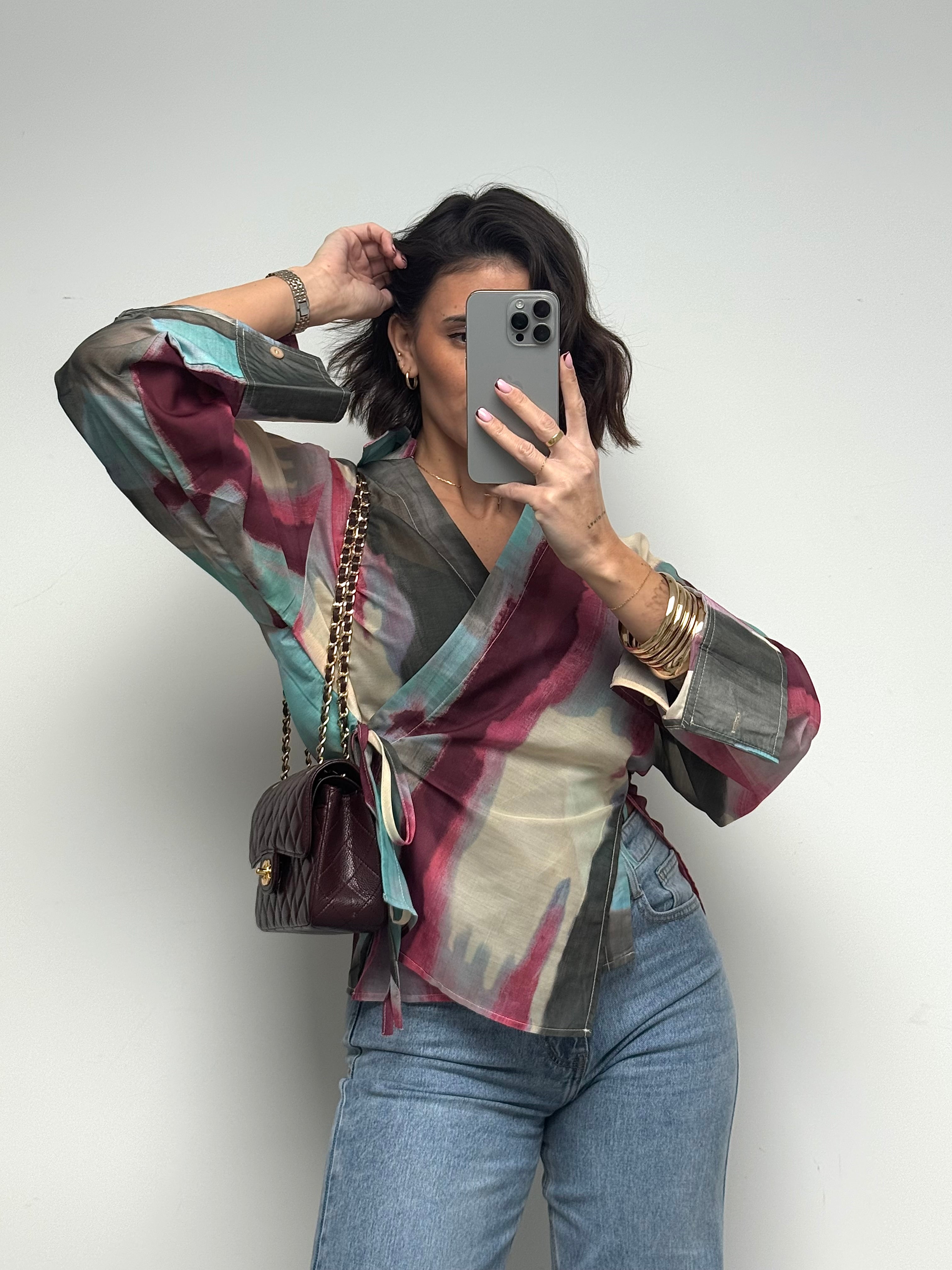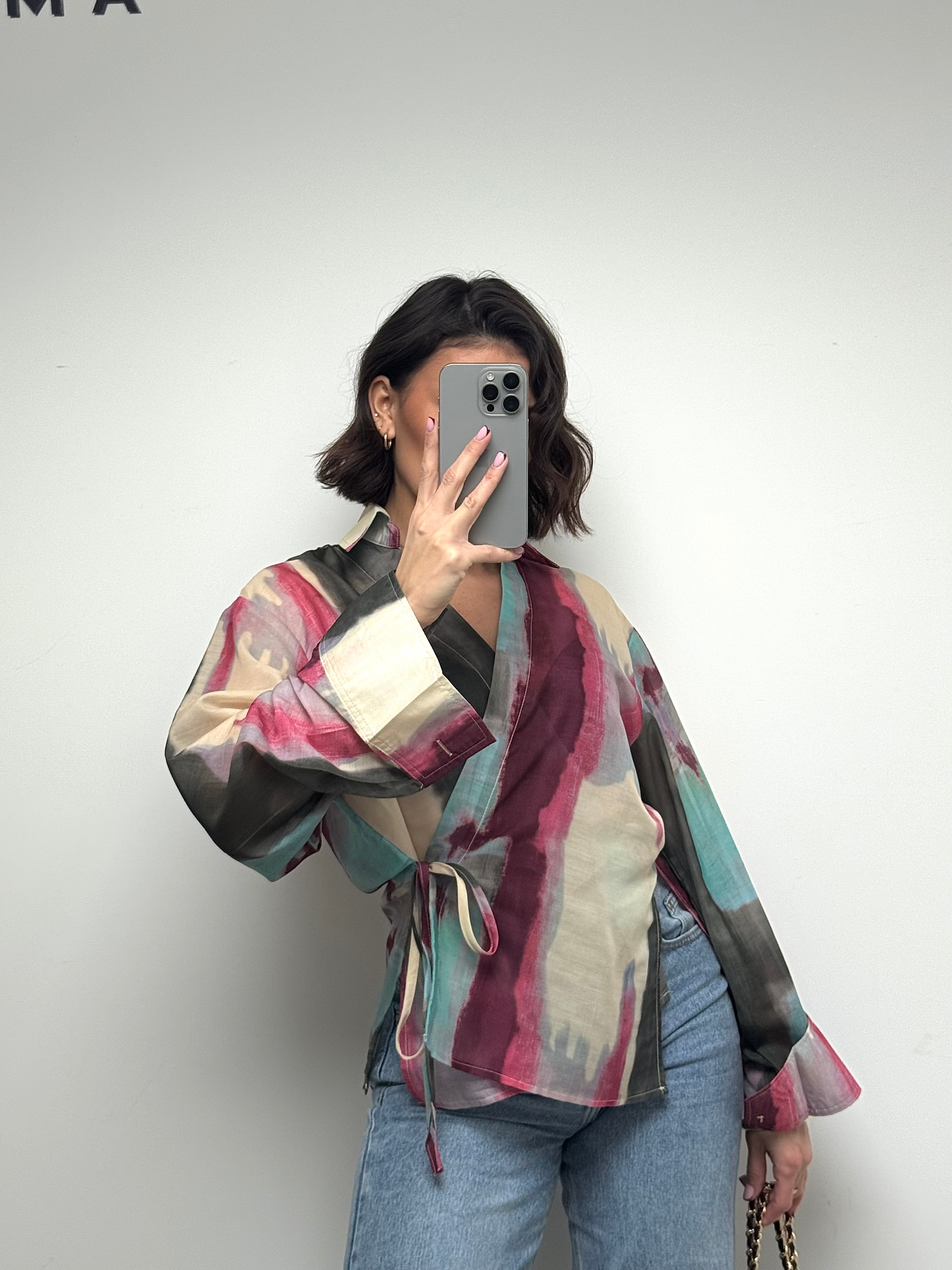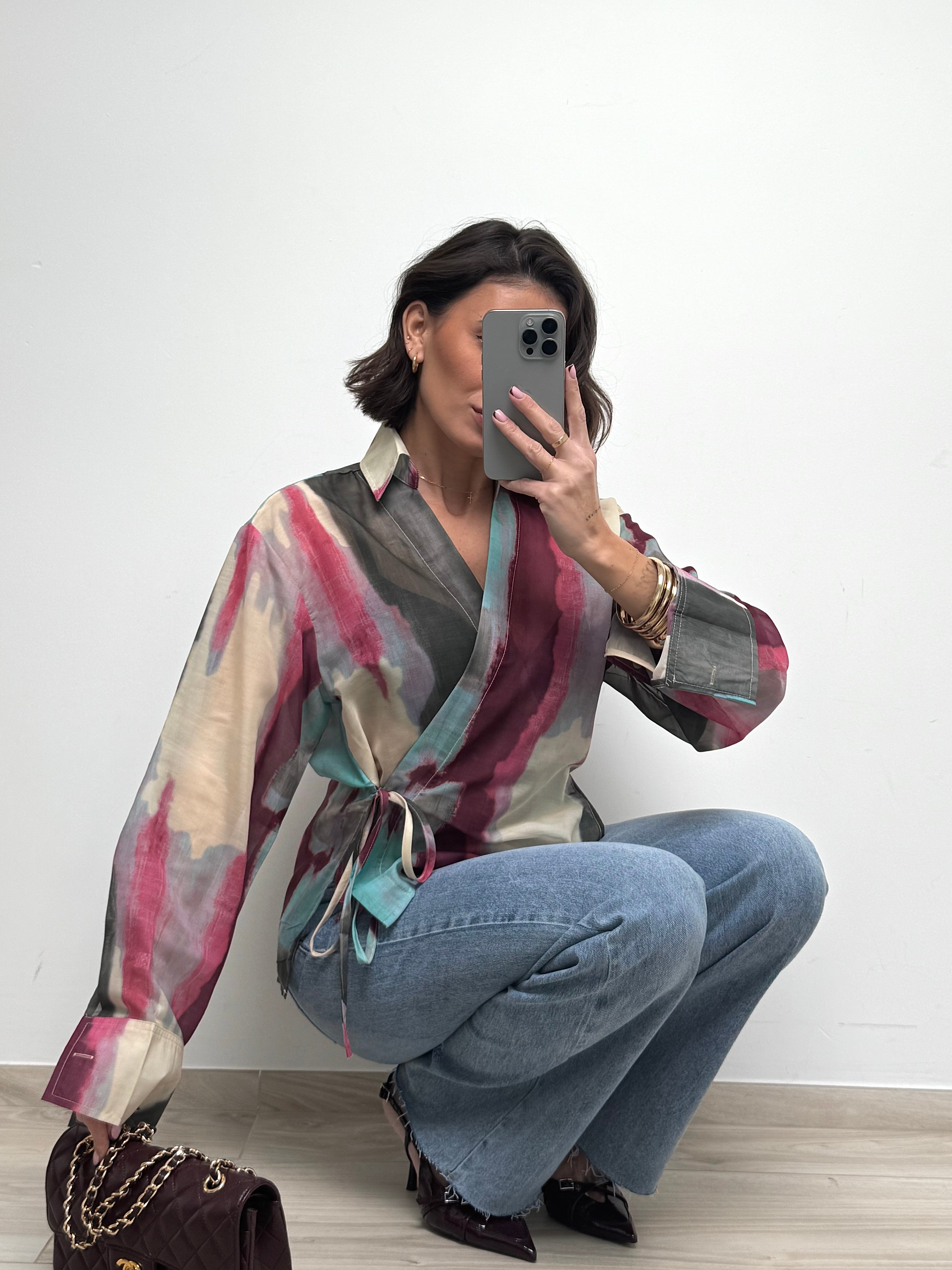 Délicat et résolument moderne, ce chemisier cache-cœur multicolore séduit par son jeu de transparence et son imprimé artistique aux nuances douces et lumineuses. Sa matière légère apporte une sensation de fluidité et de mouvement, tandis que sa coupe féminine met naturellement la silhouette en valeur. Les liens à nouer ajoutent une touche élégante et permettent un ajustement parfait. Une pièce pleine de caractère, idéale pour sublimer un look du quotidien ou apporter une note sophistiquée à une tenue plus habillée.