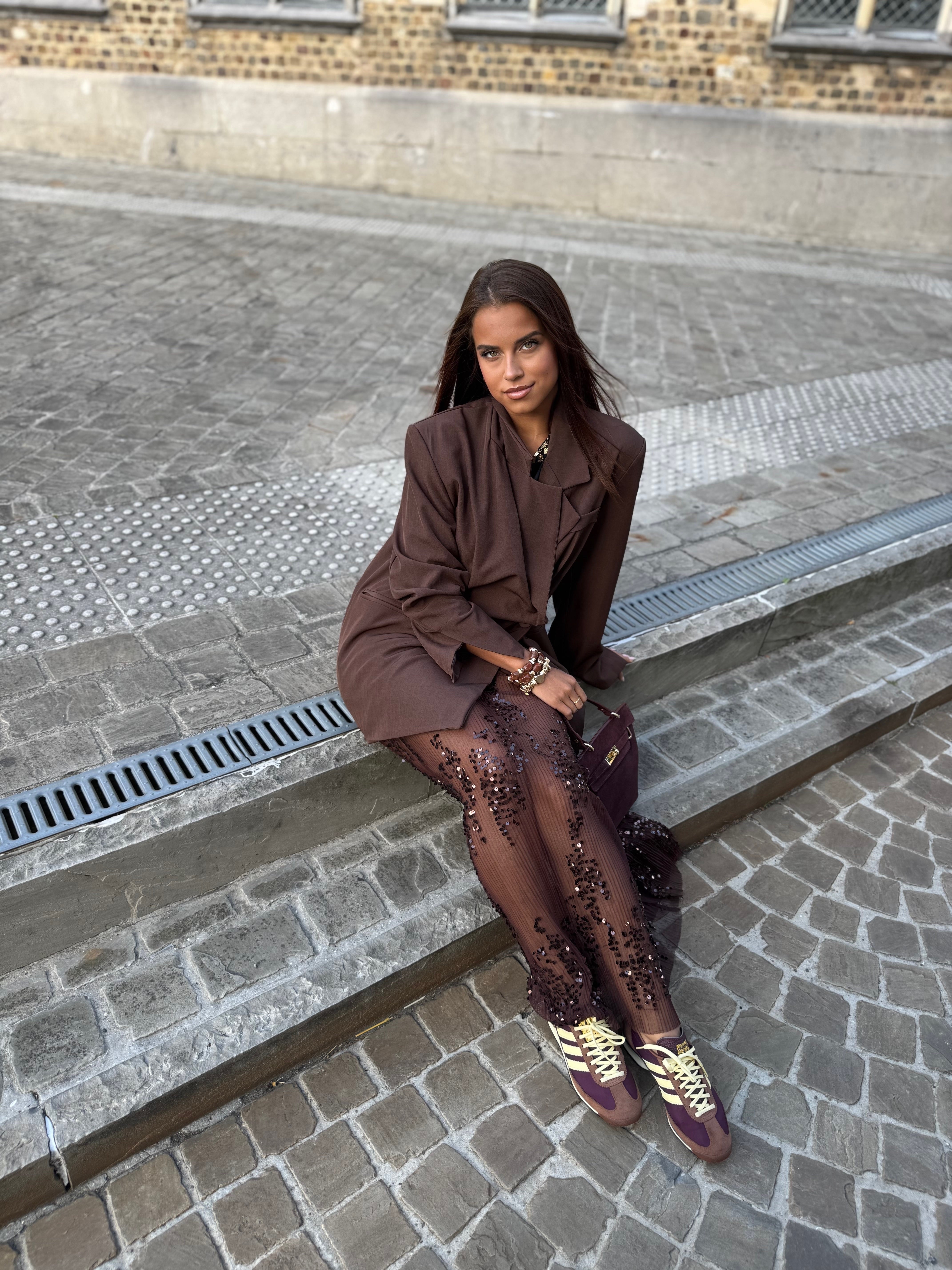 Cette jupe longue en voile orné de sequins allie glamour et sophistication. Sa transparence subtile, adoucie par une doublure légère, et ses détails scintillants créent un jeu de lumière raffiné qui apporte une touche moderne à vos tenues. Fluide et féminine, elle se porte aussi bien en journée pour un look décontracté qu’en soirée pour briller avec élégance.