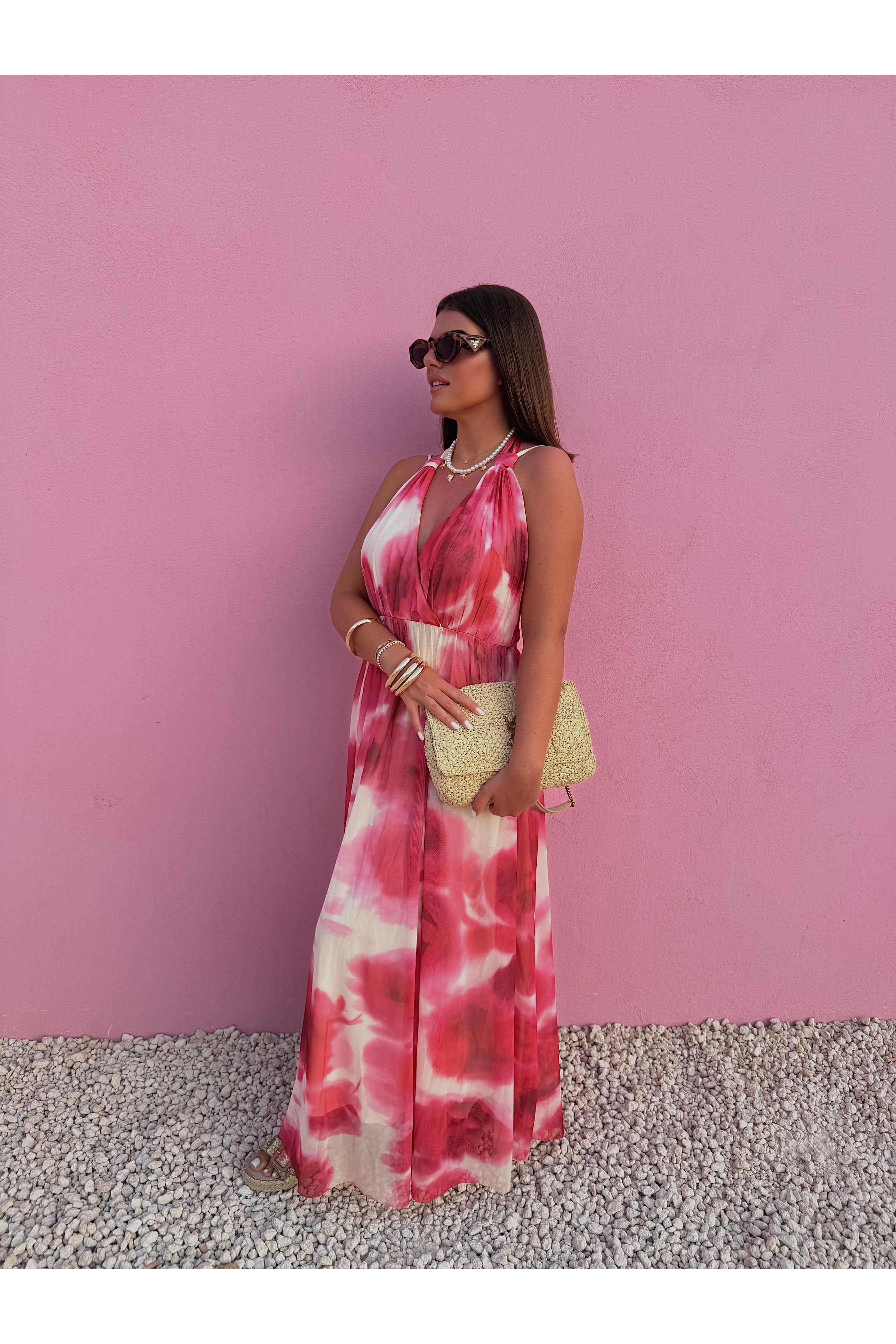 Robe mi-longue en Tissu fluide plissée. Coupe évasée. Col cache coeur en V. Double bretelles. Fermeture eclair invisible à l’arrière et noeud. Doublure.