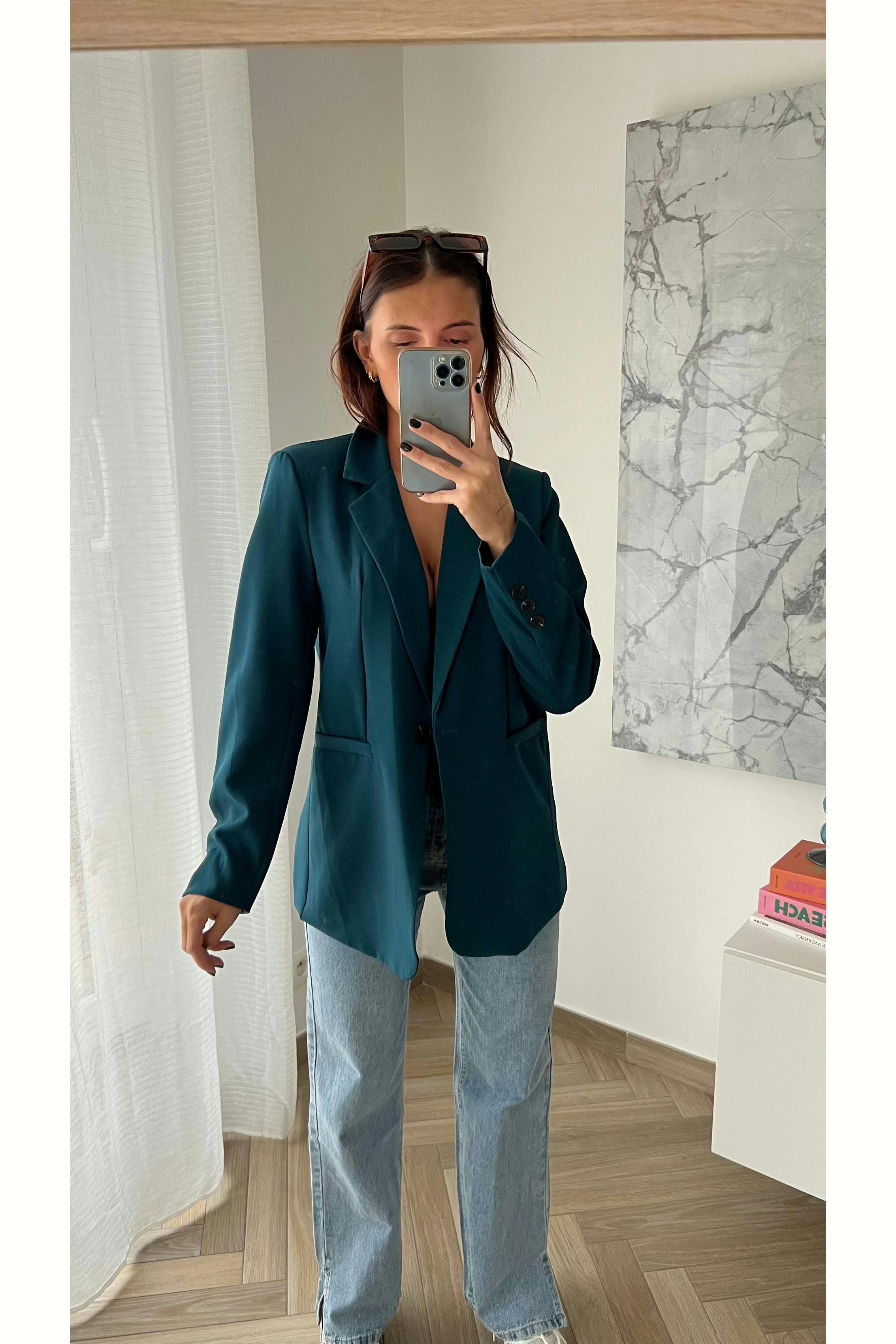 De eendenblauwe kleur is perfect voor het tussenseizoen. Draag het over je favoriete kantooroutfits voor een ultra glamoureuze working girl-look 🫶🏽