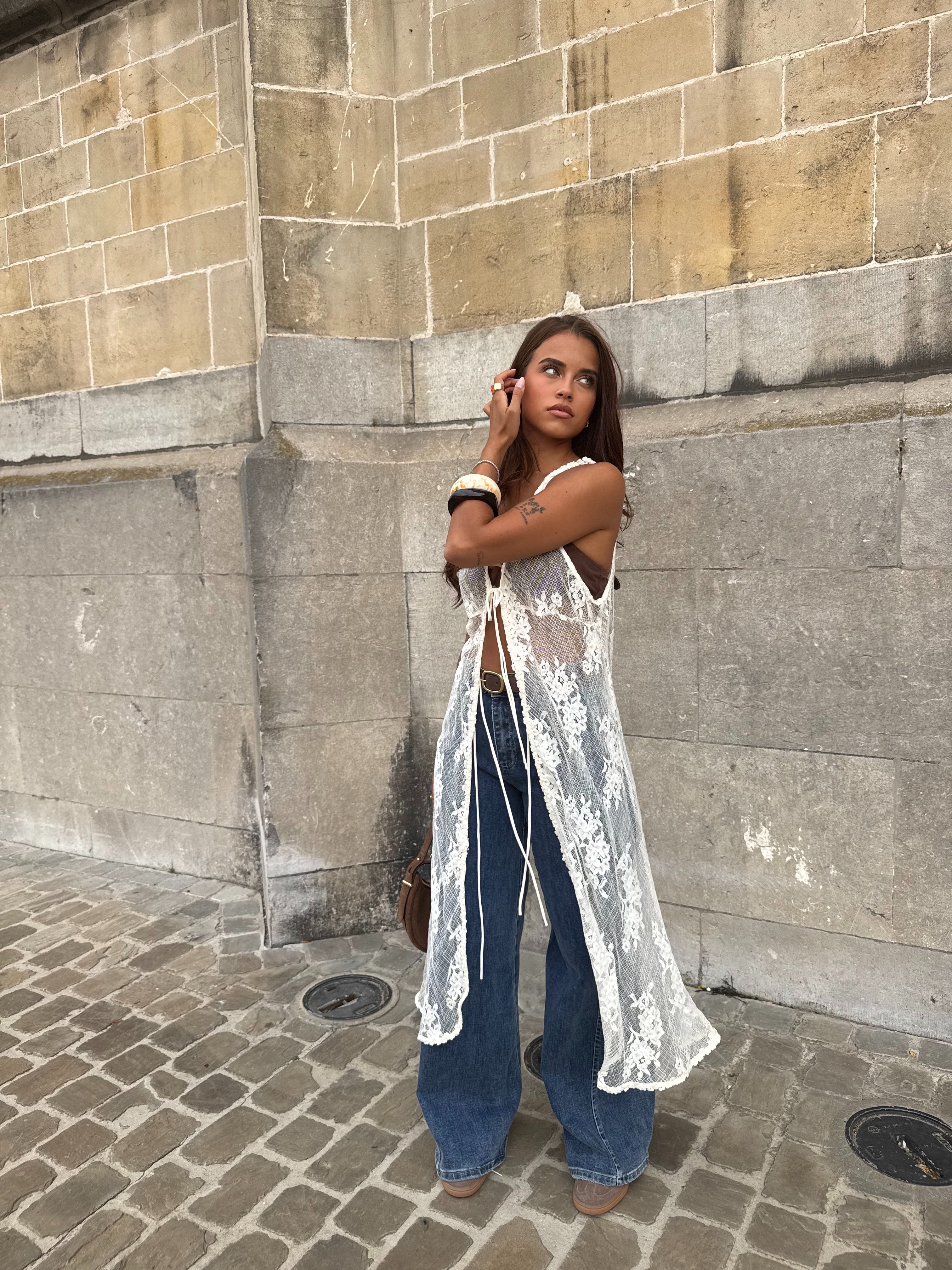 Gilet long en dentelle ajourée, coupe fluide et sans manches. Liens à nouer à l’avant. Détail de finitions festonnées. Parfait à superposer sur un top, une robe ou un maillot de bain pour un look bohème et féminin.